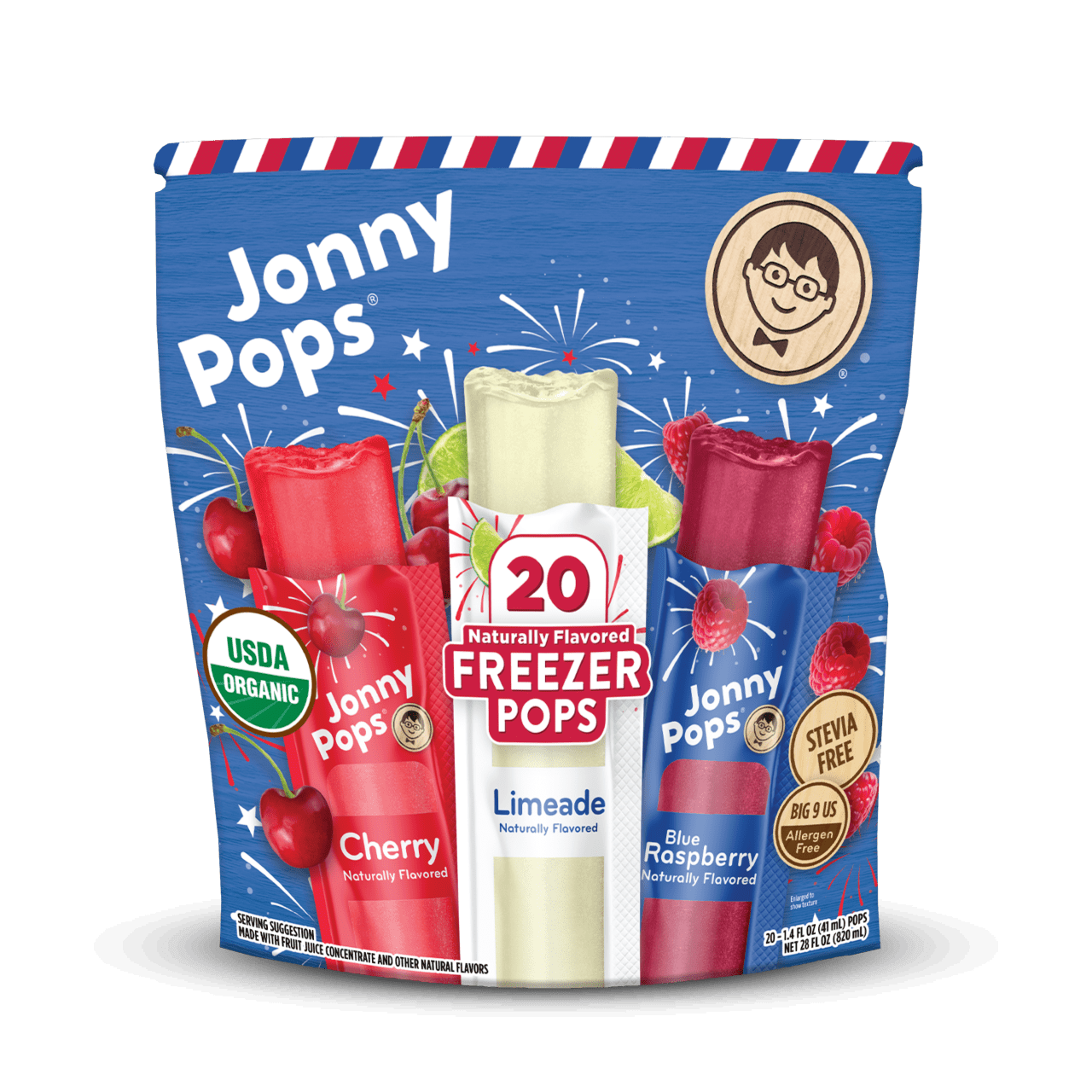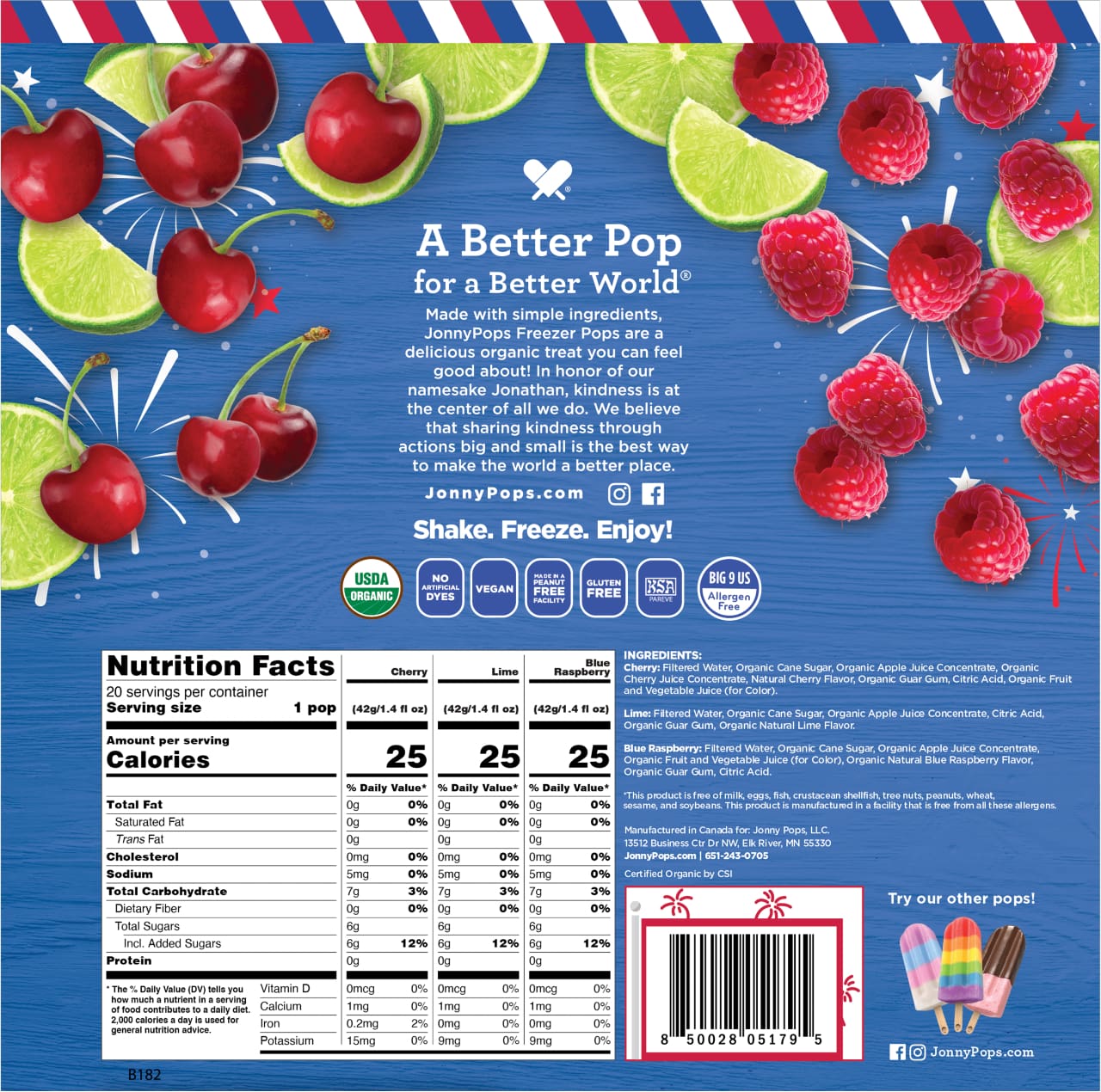 JUST SHAKE, FREEZE, AND ENJOY! Organic Red, White, & Blue Freezer Pops are the shelf-stable childhood favorite made with simple ingredients! Each bag includes Cherry, Limeade, and Blue Raspberry flavors. Made with simple ingredients, and no artificial dyes, these freezer pops are vegan, gluten-free, and made in a peanut free facility – a treat you can feel great about sharing! In honor of our namesake, Jonathan, there’s a kind deed on every wrapper. We believe sharing kindness through actions big and small makes the world a better place. A Better Pop for a Better World!®