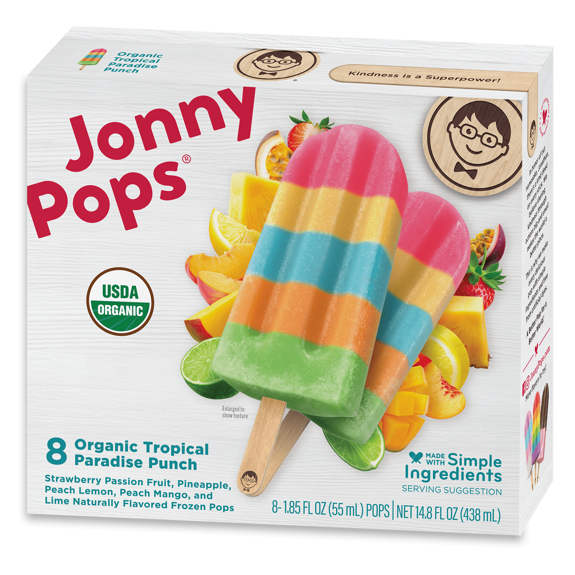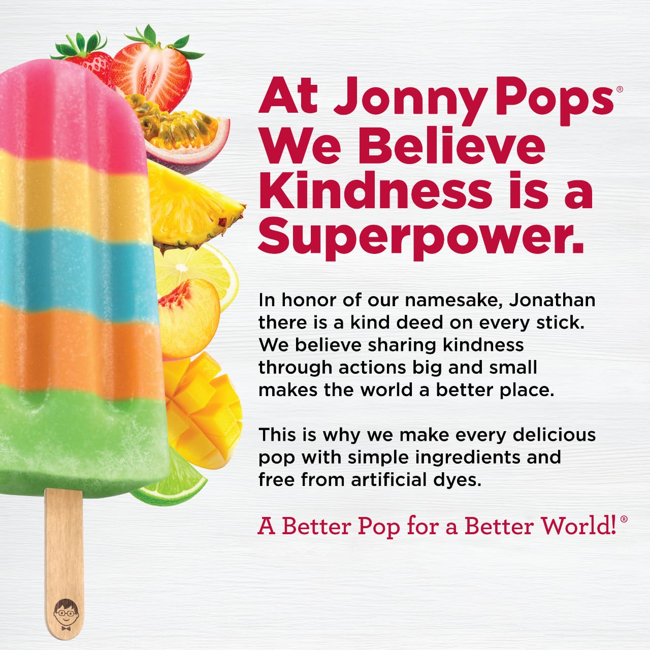 When a tropical break is what you’re looking for, Organic Tropical Paradise Punch gives you the sweet taste of vacation. Enjoy a blend of tropical flavors in every layer – strawberry passion fruit, pineapple, peach lemon, peach mango, and lime. Made with simple ingredients and no artificial dyes, these pops are vegan, gluten-free and made in a peanut free facility – a treat you can feel great about sharing! In honor of our namesake, Jonathan, there’s a kind deed on every stick. We believe sharing kindness through actions big and small makes the world a better place. A Better Pop for a Better World!®