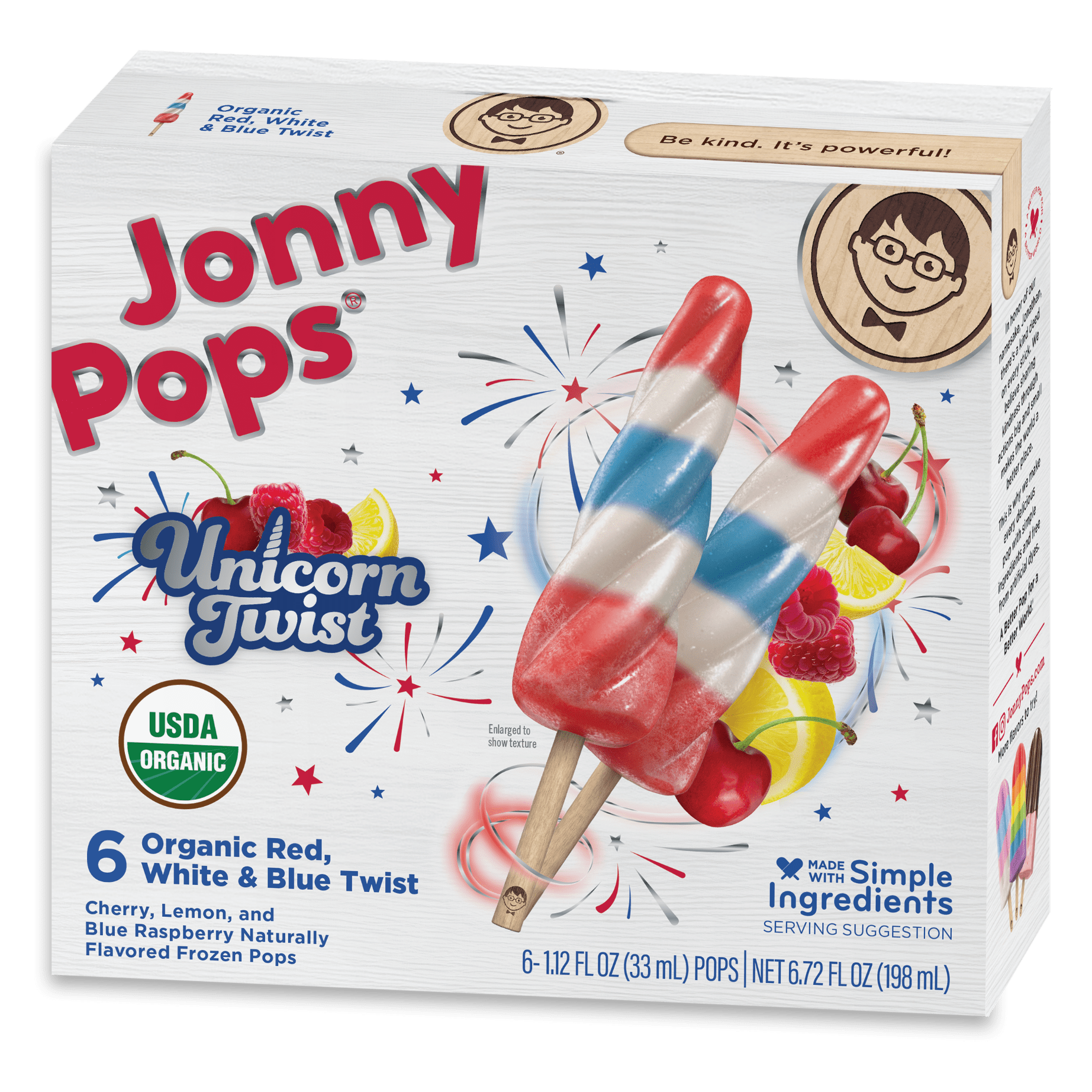 A “twist” on a summertime favorite! Unicorn Twist Organic Red, White & Blue Twist naturally flavored frozen pops are the perfect treat for your celebration. Each pop is a delicious blend of cherry, lemon, and blue raspberry flavors. Made with simple ingredients and no artificial dyes, these pops are vegan, gluten-free, and made in a peanut free facility – a treat you can feel great about sharing with all the unicorns and dreamers in your life. Perfect for summertime celebrations, picnics, and your favorite sporting events. In honor of our namesake, Jonathan, there’s a kind deed on every stick. We believe sharing kindness through actions big and small makes the world a better place. A Better Pop for a Better World!®